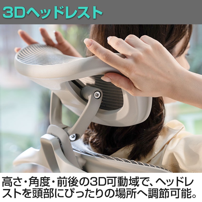 高さ・角度・前後の3D可動域で、ヘッドレストを頭部にぴったりの場所へ調節可能。 まるでオーダーメイドのように頭を優しく包み込みます。