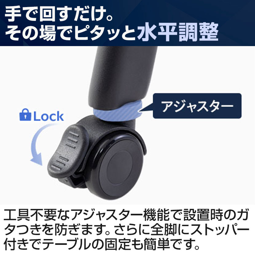 工具不要なアジャスター機能で高さを微調整でき、設置時のガタつきを防ぎます。さらに全脚にストッパー付きでテーブルの固定も簡単です。