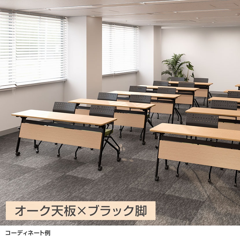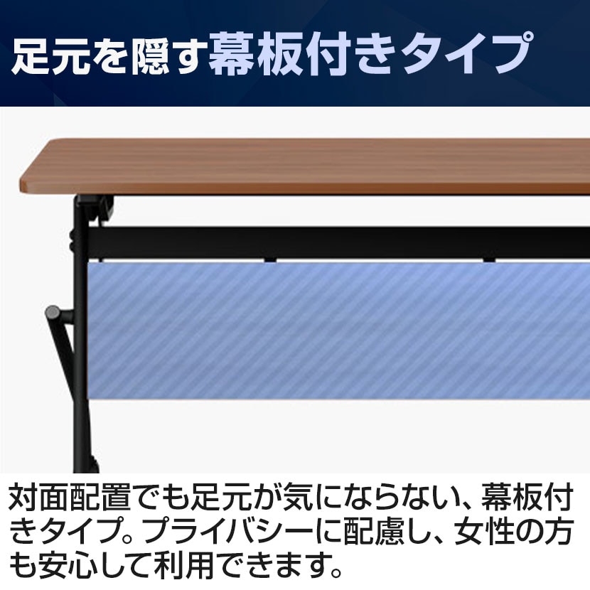 中棚をなくした開放的なデザインで、足元の窮屈さを解消。長時間の会議やセミナーでも集中力を維持しやすい設計です。使わないときはサッと重ねて片付けられ、収納も省スペース。天板には傷や汚れに強いメラミン素材を採用し、日常的な使用にも安心です。コストパフォーマンスに優れ、少人数から大人数まで会議や研修などに幅広くご使用いただけます。