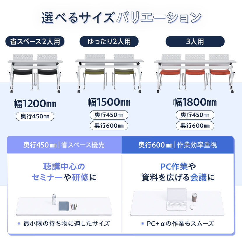 幅は人数に応じて選べる1200/1500/1800mmの3サイズをラインアップ。奥行は用途に合わせて選べる2種類をご用意(幅1500/1800mmのみ)。奥行450mmは限られたスペースに1台でも多く並べたいなど省スペースを優先したい場合に、600mmはPCを使いながらの研修など、作業効率を優先したい場合におすすめです。