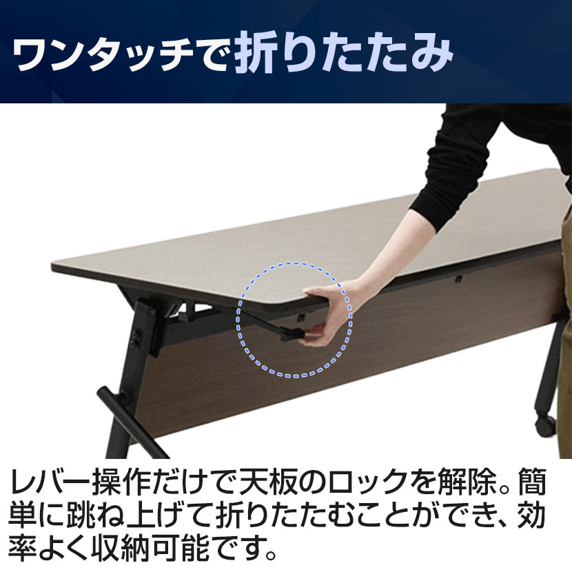 レバー操作だけで天板のロックを解除。簡単に跳ね上げて折りたたむことができ、効率よく収納可能です。