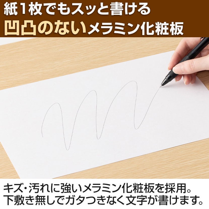 天板には凹凸のないメラミン化粧板を使用。紙一枚でもペン先が引っかからず、汚れもさっと拭き取れてお手入れが簡単です。