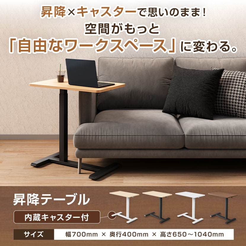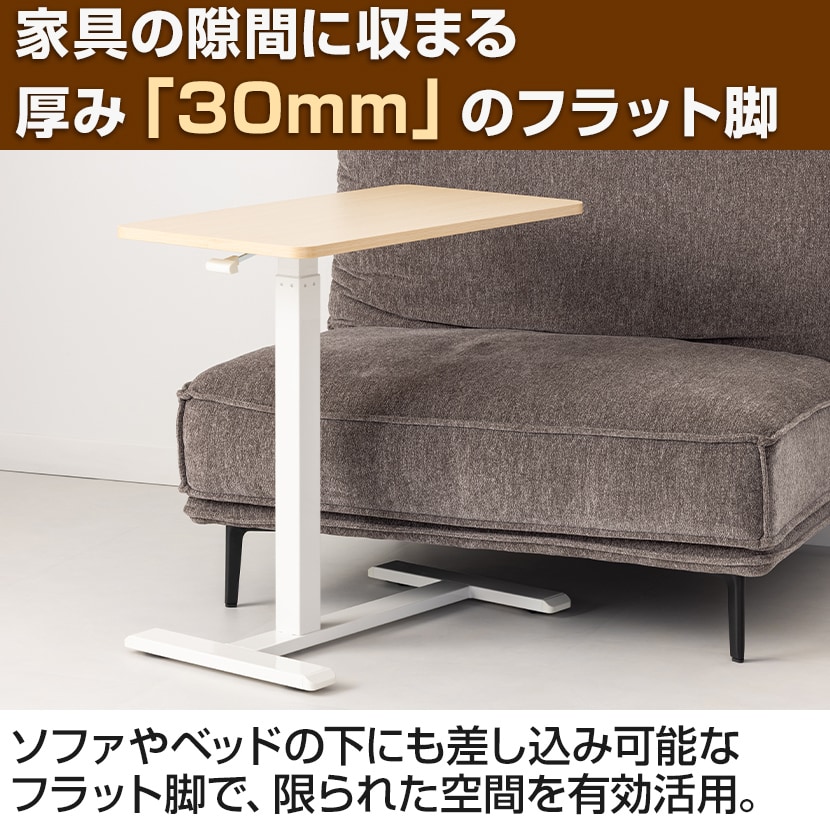 650~1040mmまで無段階で高さ調節ができ、家具の下に差し込めるフラット脚を採用。座り作業から立ち作業まで、使う場所に合わせて柔軟に高さを変えられます。内蔵キャスターで移動もスムーズ。デスク脇のサブテーブルからソファ横まで、限られた空間を瞬時に作業スペースに変え、自由なワークスタイルを実現します。
