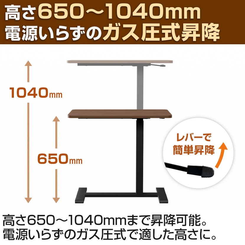 650~1040mmまで無段階昇降が可能。電源やコード配線が不要なガス圧式のため、設置場所を選ばず、空間を自由に行き来できます。