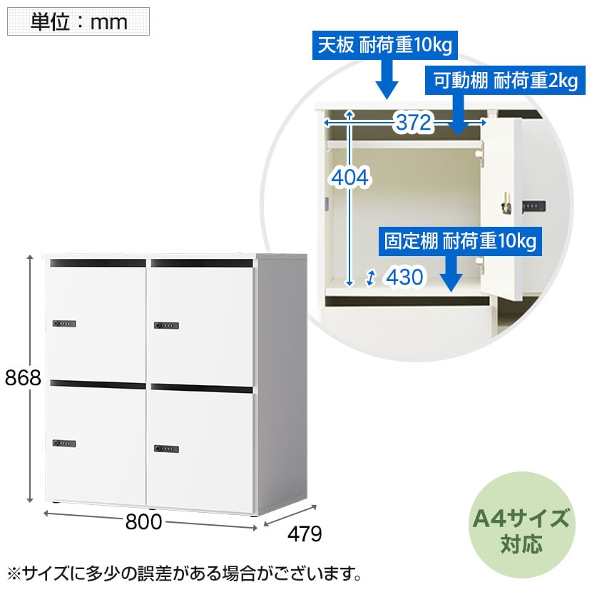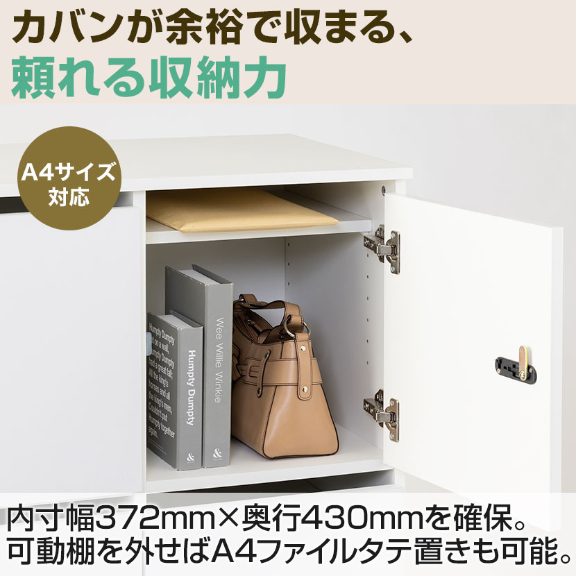 内寸幅372mm×奥行430mmを確保。可動棚をはずせばA4ファイルタテ置きにも対応し、個人の荷物や資料をしっかり収納できます。