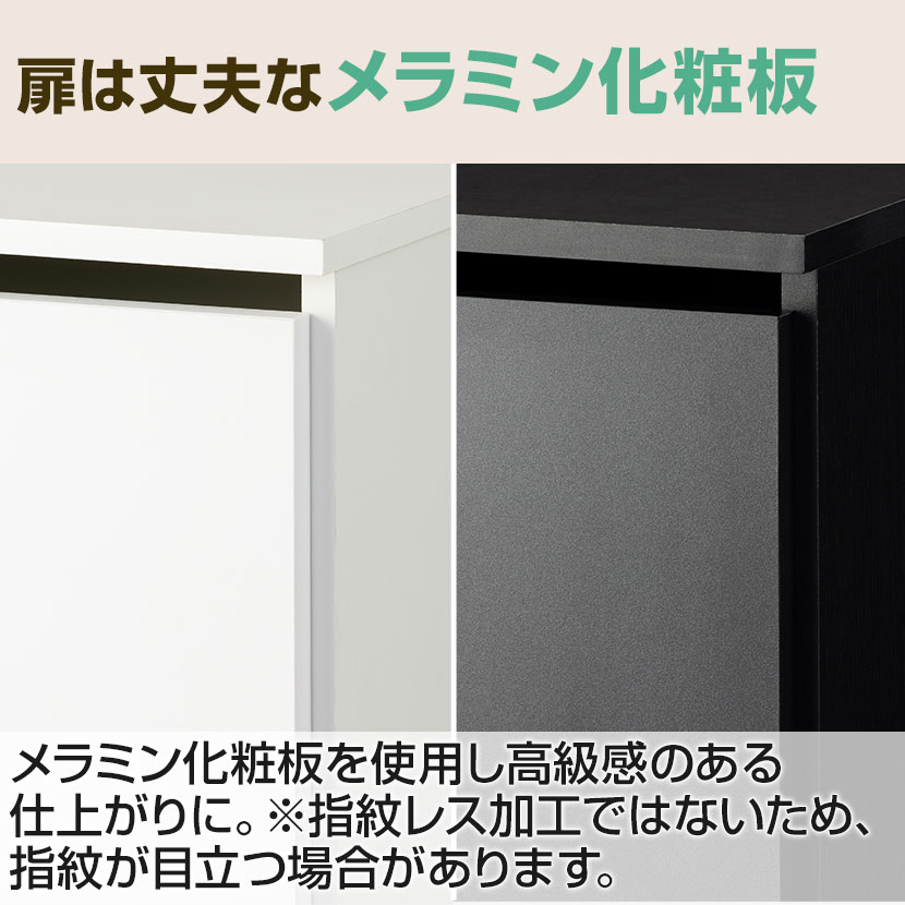 扉は丈夫なメラミン化粧板を使用し、高級感のある仕上がりに。※指紋レス加工ではないため、指紋が目立つ場合があります。