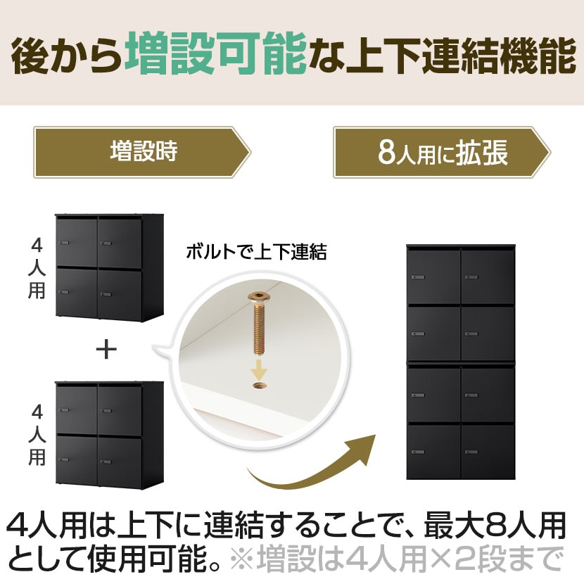 4人用ロッカーは上下に連結することで、最大8人用として活用可能です。人員増加やレイアウト変更にも柔軟に対応でき、無駄なく収納を拡張できます。