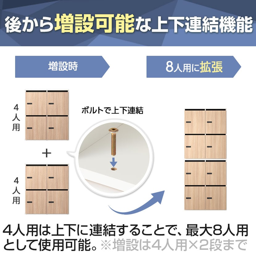 4人用ロッカーは上下に連結することで、最大8人用として活用可能です。人員増加やレイアウト変更にも柔軟に対応でき、無駄なく収納を拡張できます。