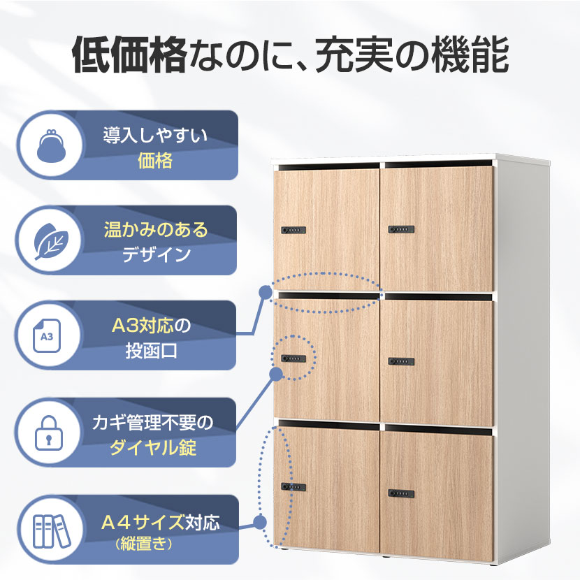 扉上部の投函口により、不在時の書類配布がスムーズに。A3封筒にも対応し、個人の受け渡し業務の手間を削減します。