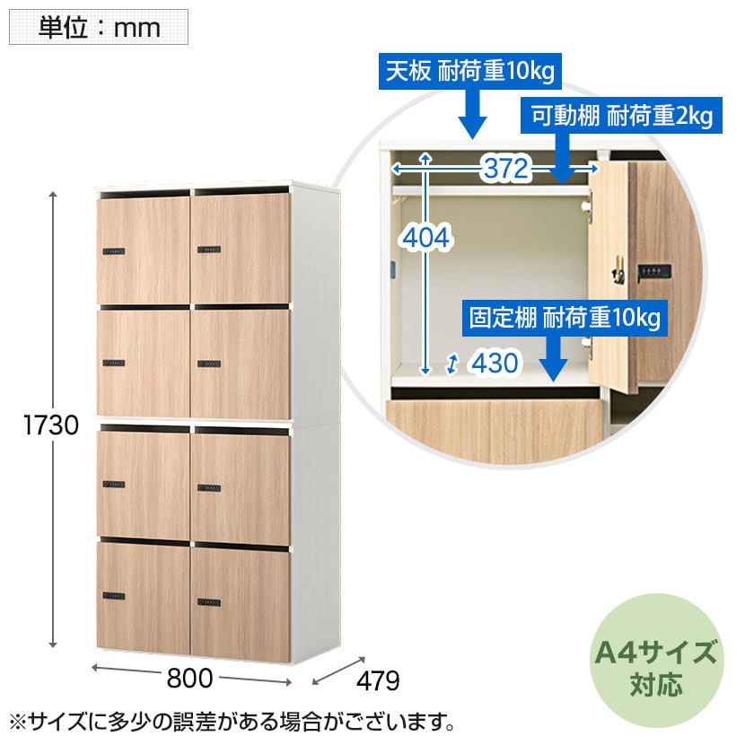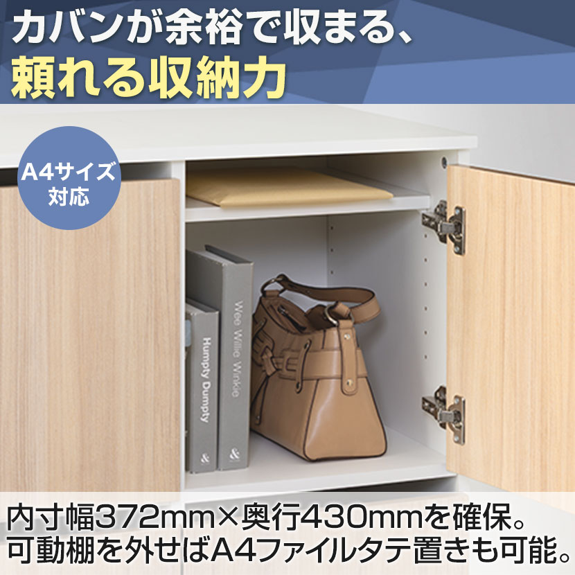 内寸幅372mm×奥行430mmを確保。可動棚をはずせばA4ファイルタテ置きにも対応し、個人の荷物や資料をしっかり収納できます。