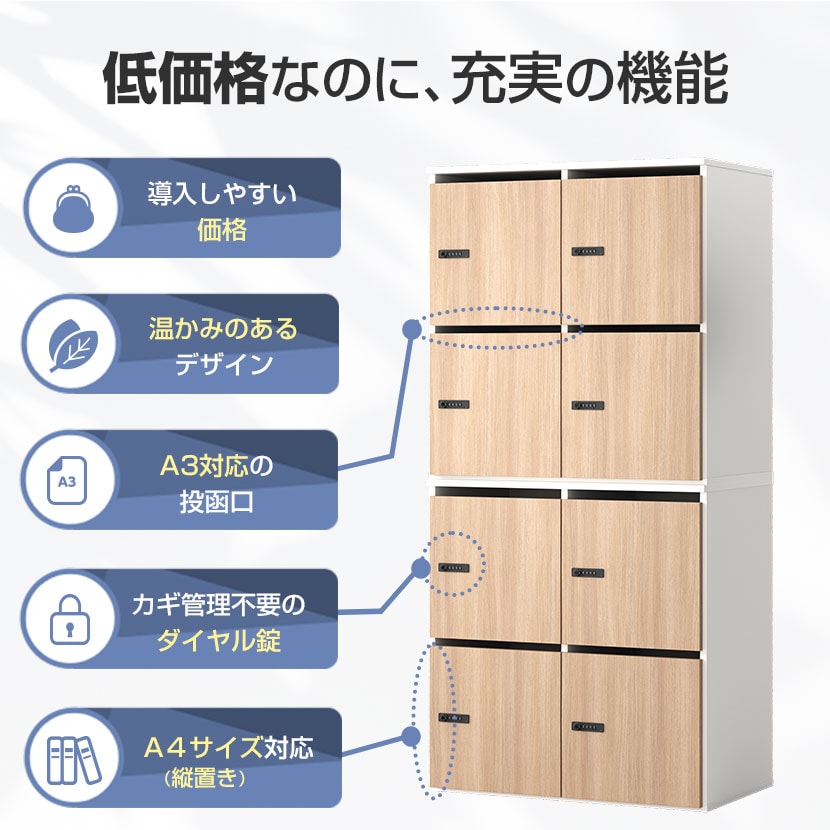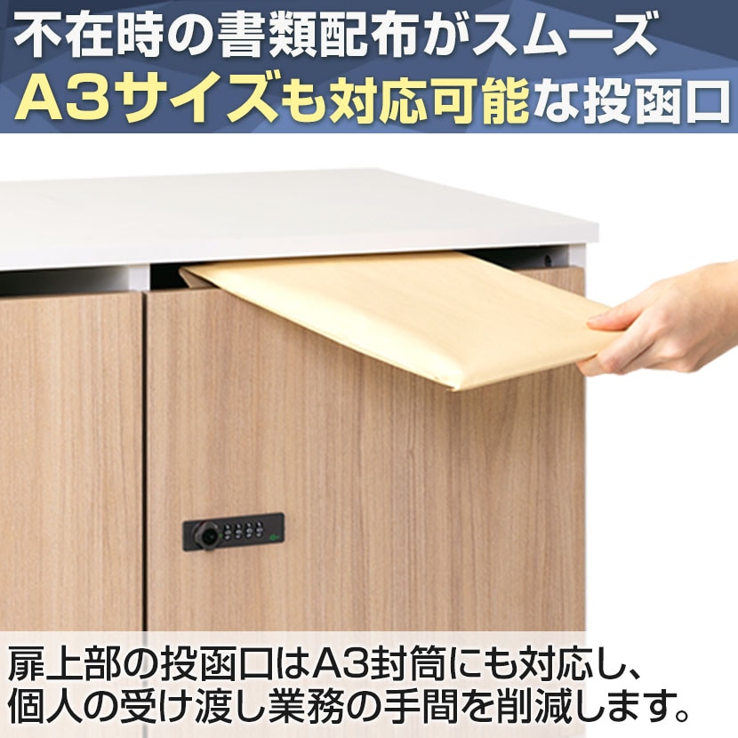扉上部の投函口により、不在時の書類配布がスムーズに。A3封筒にも対応し、個人の受け渡し業務の手間を削減します。