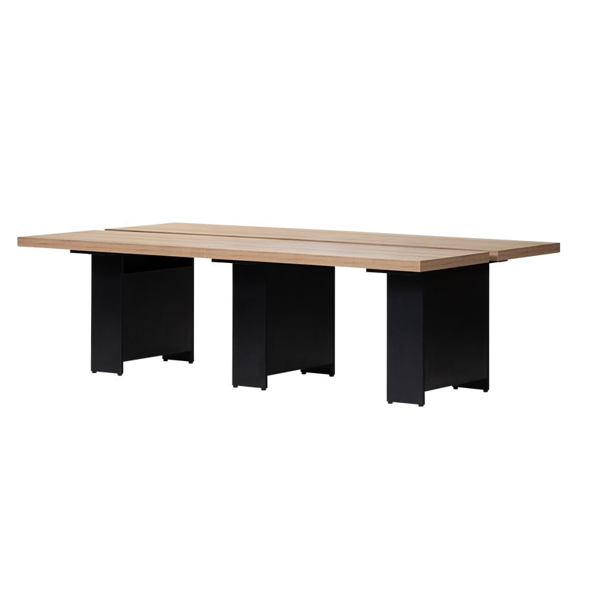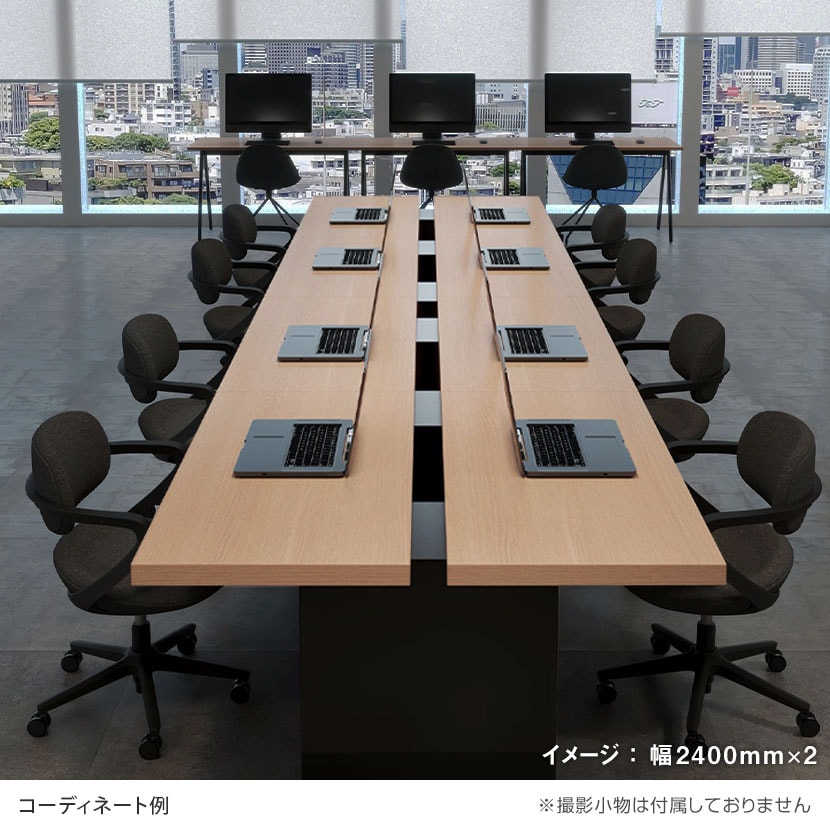 ブラックのボックス脚と厚みのある天板が、ダークトーンの空間と美しく調和。オフィスの印象を引き締め、落ち着きと信頼感のある空間を演出します。