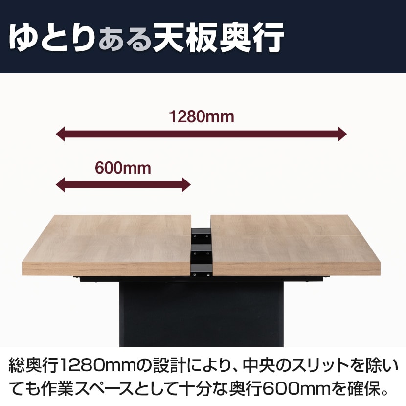 総奥行1280mmの設計により、中央のスリットを除いても作業スペースとして十分な奥行600mmを確保。