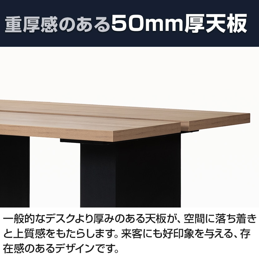 一般的なデスクより厚みのある天板が、空間に落ち着きと上質感をもたらします。来客にも好印象を与える、存在感のあるデザインです。