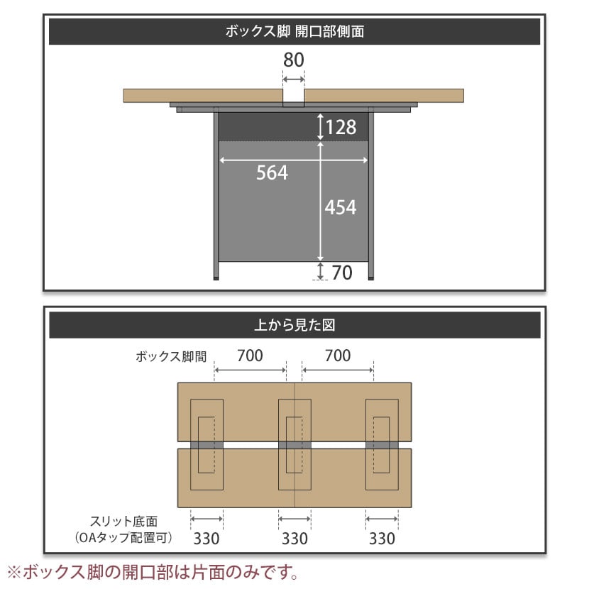 ボックス脚がある位置でも、天板端から340mmの膝元スペースを確保。脚の位置によって座る場所が制限されません。