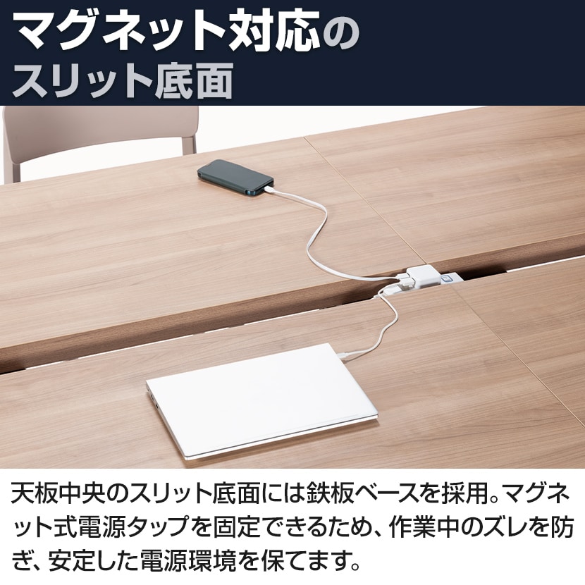 天板中央のスリット底面には鉄板ベースを採用。マグネット式電源タップを固定できるため、作業中のズレを防ぎ、安定した電源環境を保てます。