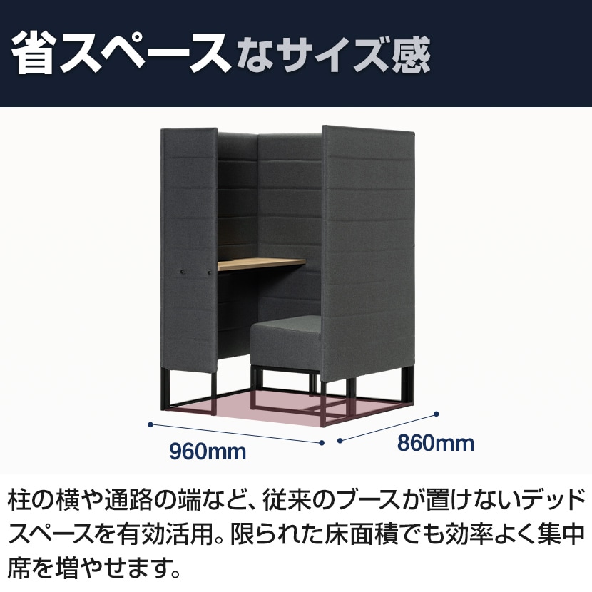 柱の横や通路の端など、従来のブースが置けないデッドスペースを有効活用。限られた床面積でも効率よく集中席を増やせます。