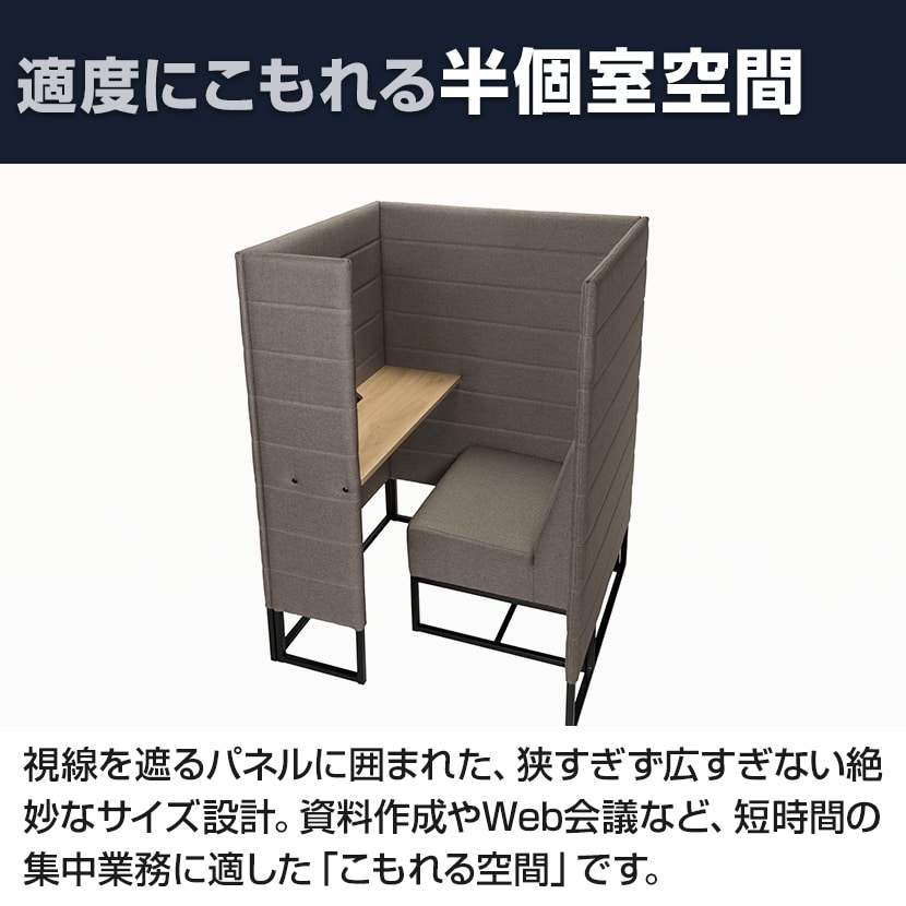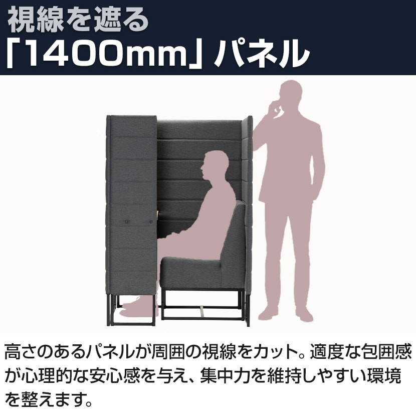 高さのあるパネルが周囲の視線をカット。適度な包囲感が心理的な安心感を与え、集中力を維持しやすい環境を整えます。