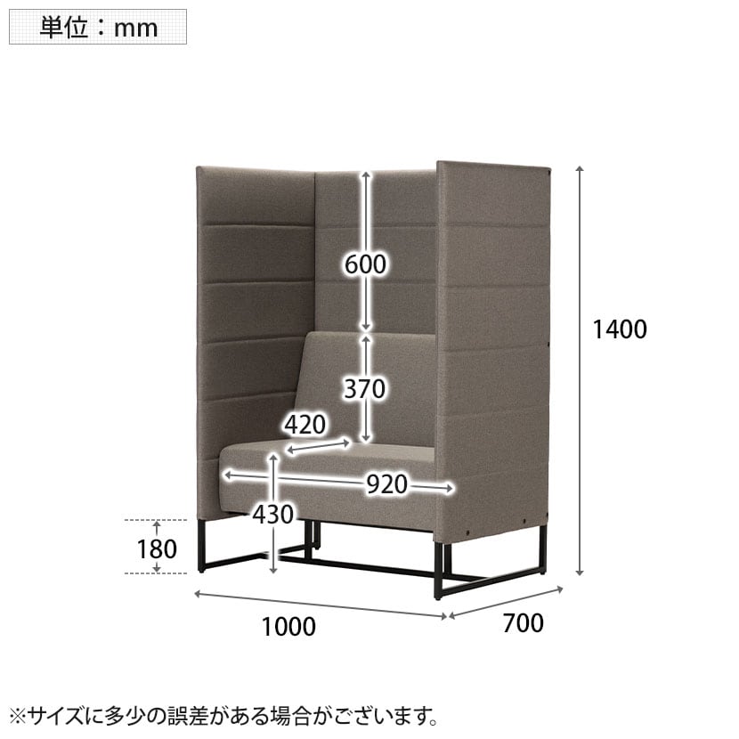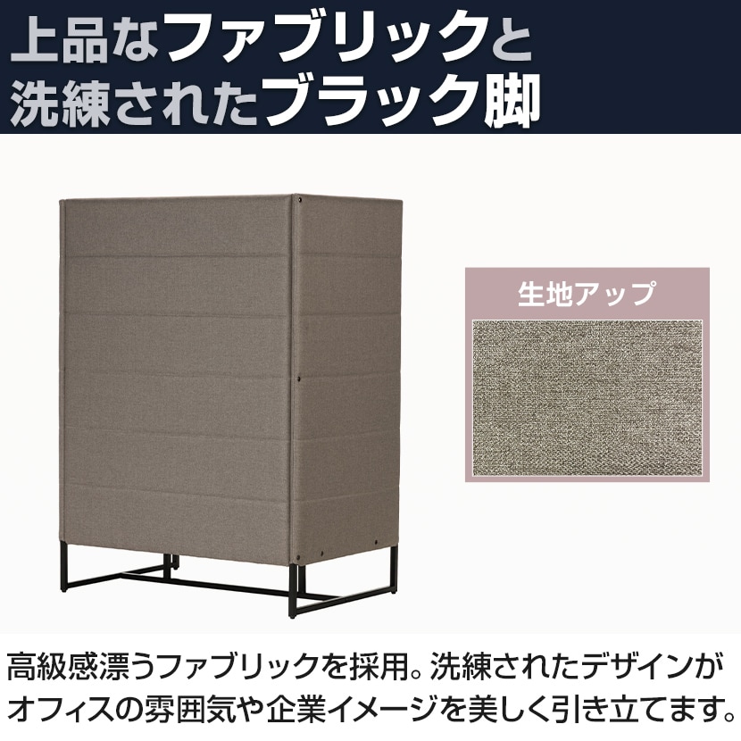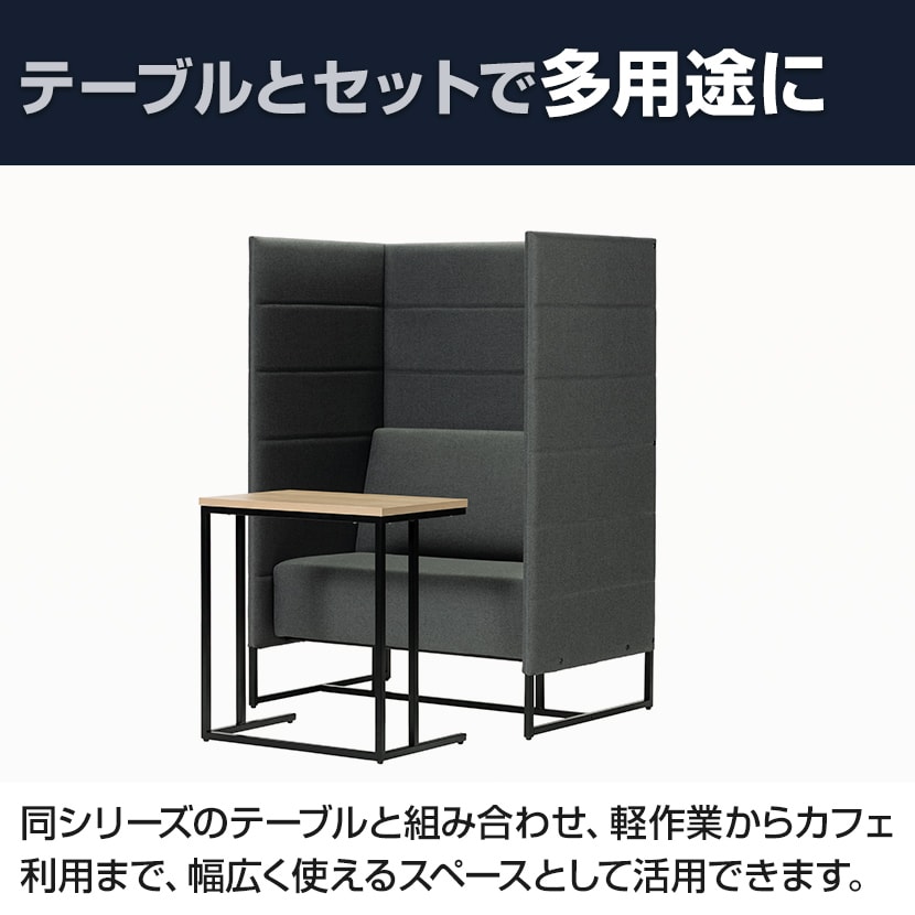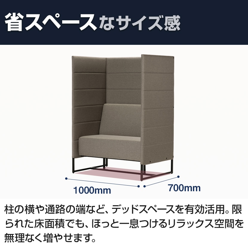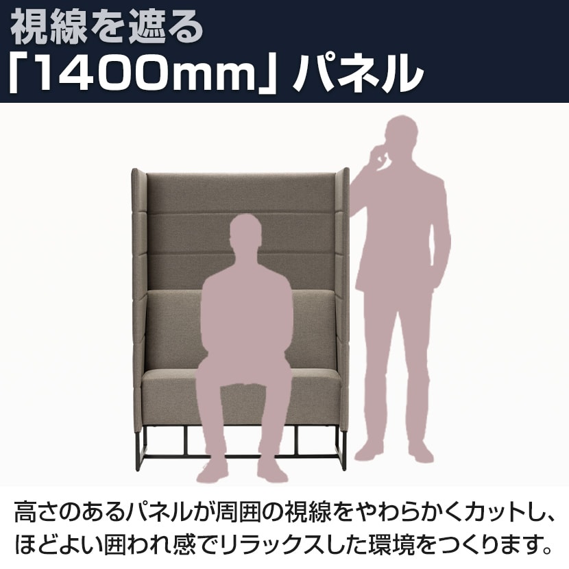 高さ1400mmのハイバックパネルが三方向を囲い、周囲の視線をやわらかく遮ることで、オープンスペースにいながらも”ほどよく囲われた落ち着き”を生み出します。横幅にゆとりを持たせた座面は、手荷物を置いても窮屈にならず、作業や待ち時間も快適に過ごせる設計。上品なファブリックの表情とブラック脚が空間を引き締め、オフィスや共用部に自然と馴染みます。省スペースサイズのため、限られたスペースに深い没入感とリラックスを創出します。