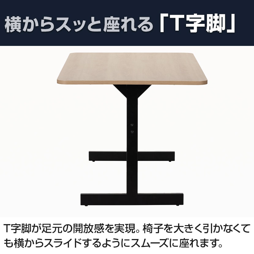 T字脚が足元の開放感を実現。椅子を大きく引かなくても横からスライドするようにスムーズに座れます。