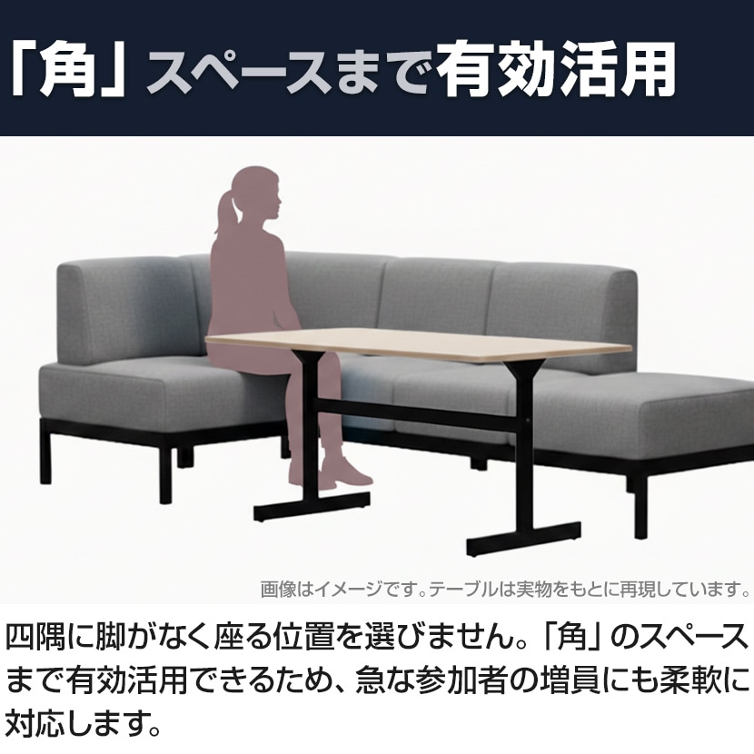 四隅に脚がなく座る位置を選びません。「角」のスペースまで有効活用できるため、急な参加者の増員にも柔軟に対応します。