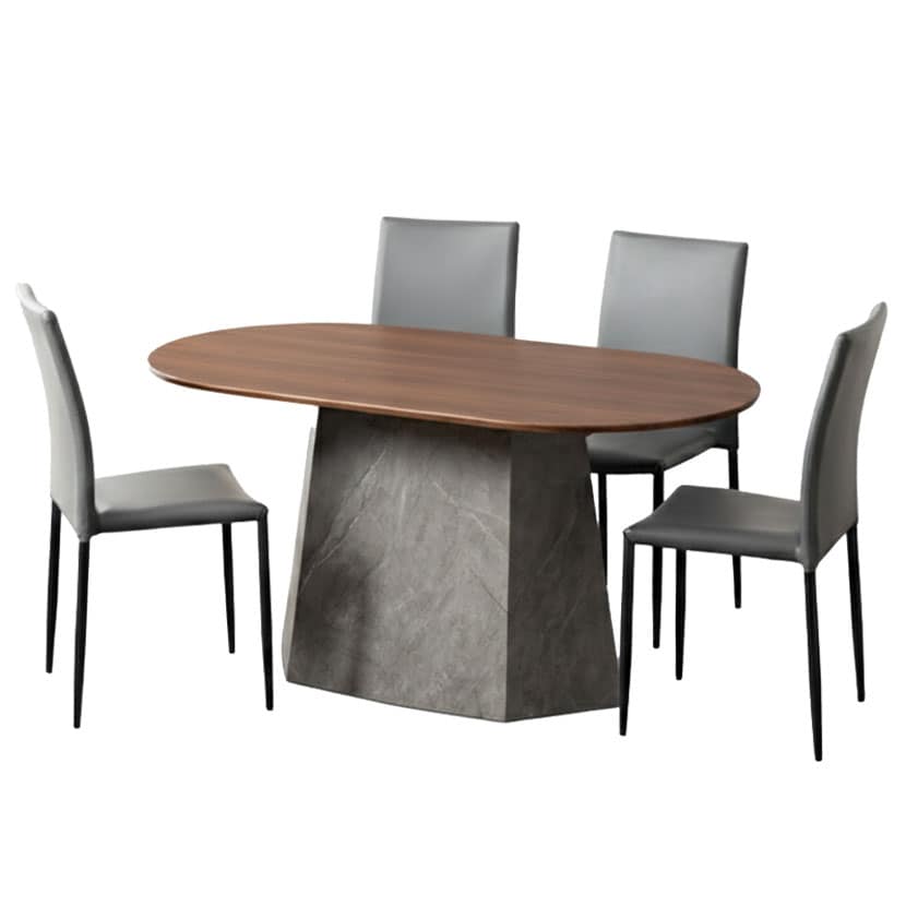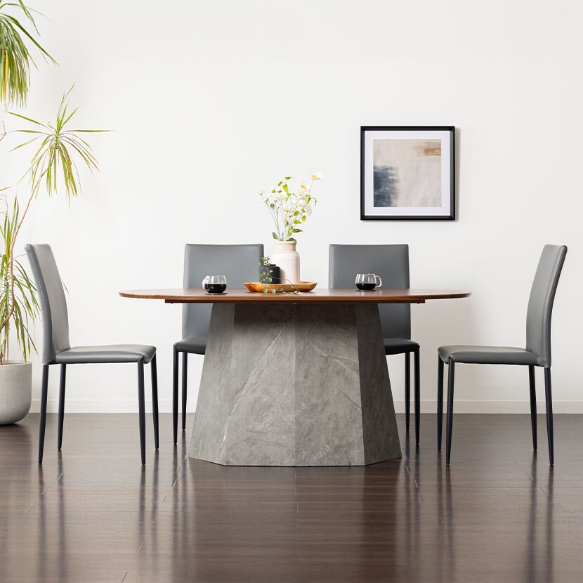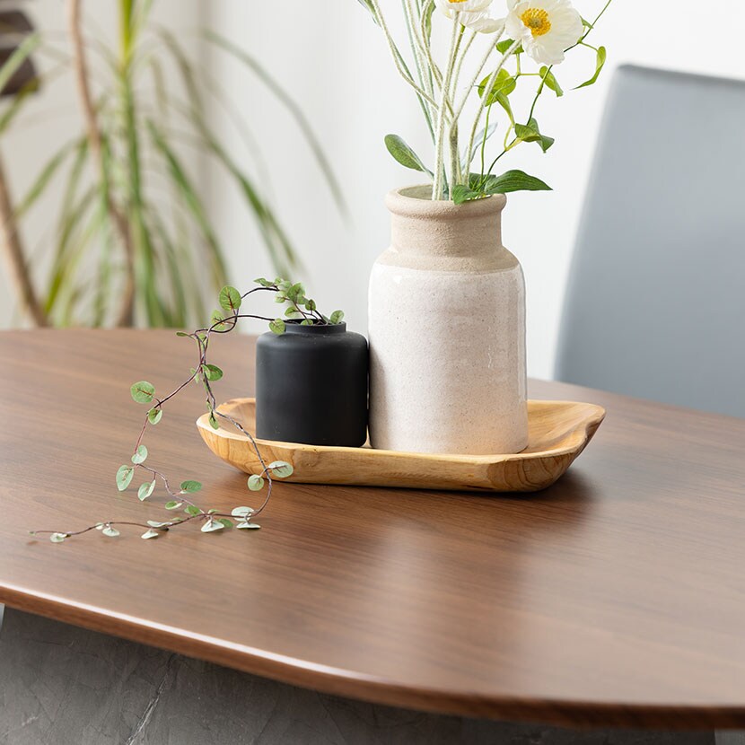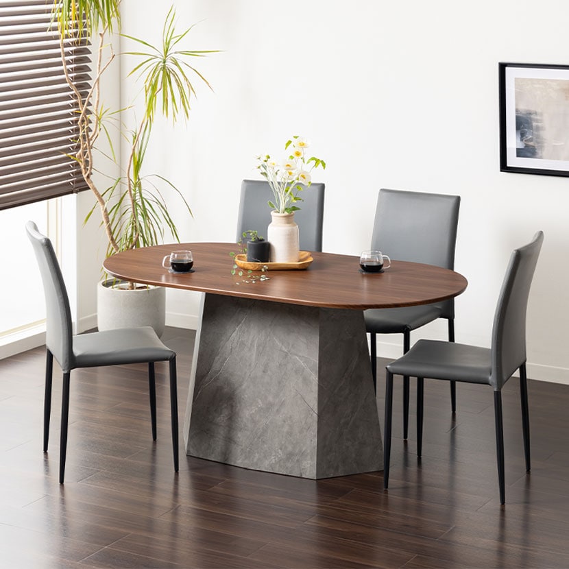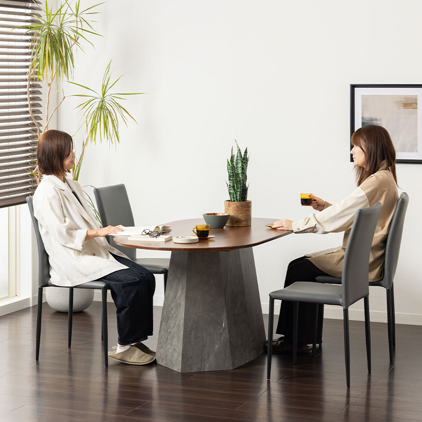 温かみのある木目調の天板と、重厚感のある大理石調の脚を組み合わせました。