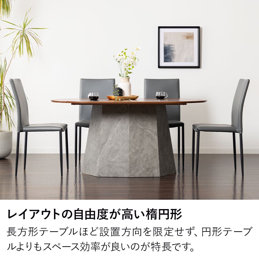 楕円形のテーブルは、長方形テーブルほど設置方向を限定せず、円形テーブルよりもスペース効率が良いのが特長です。