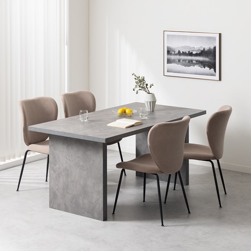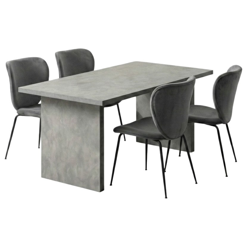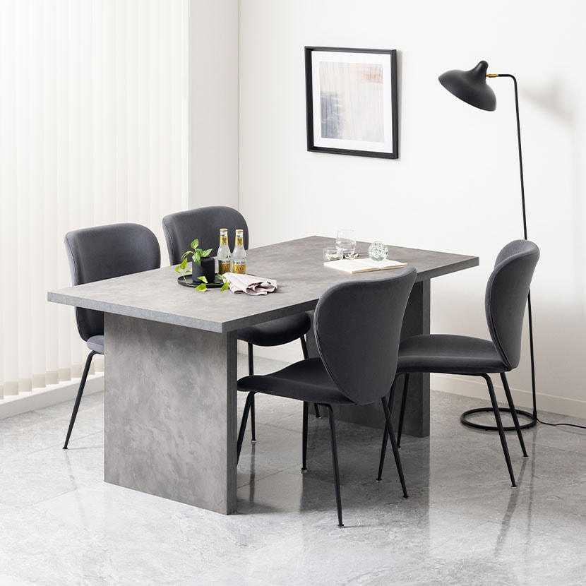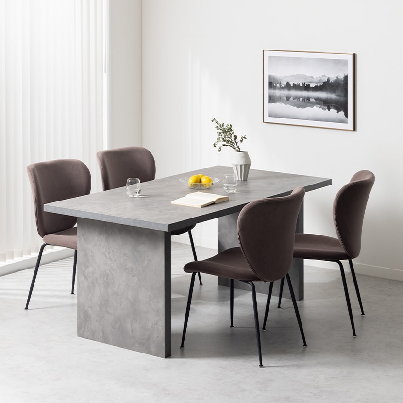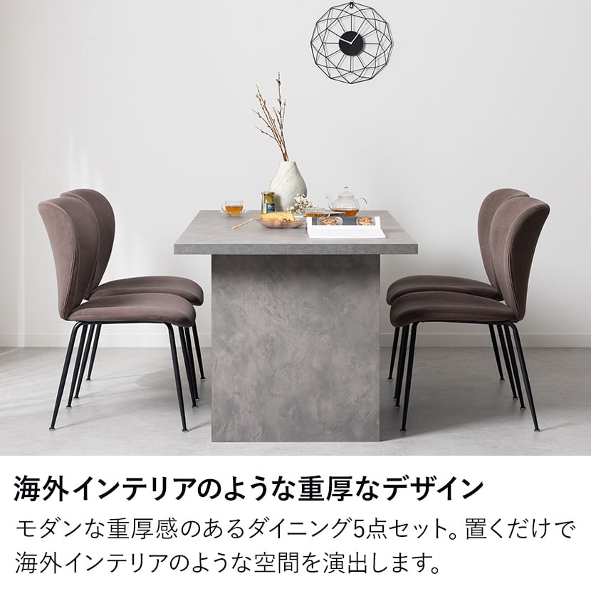 まるでモデルハウスのオーダー家具のような、重厚感と洗練されたデザインを兼ね備えた、グレーのSTONEAダイニングテーブルとチェアの5点セット。