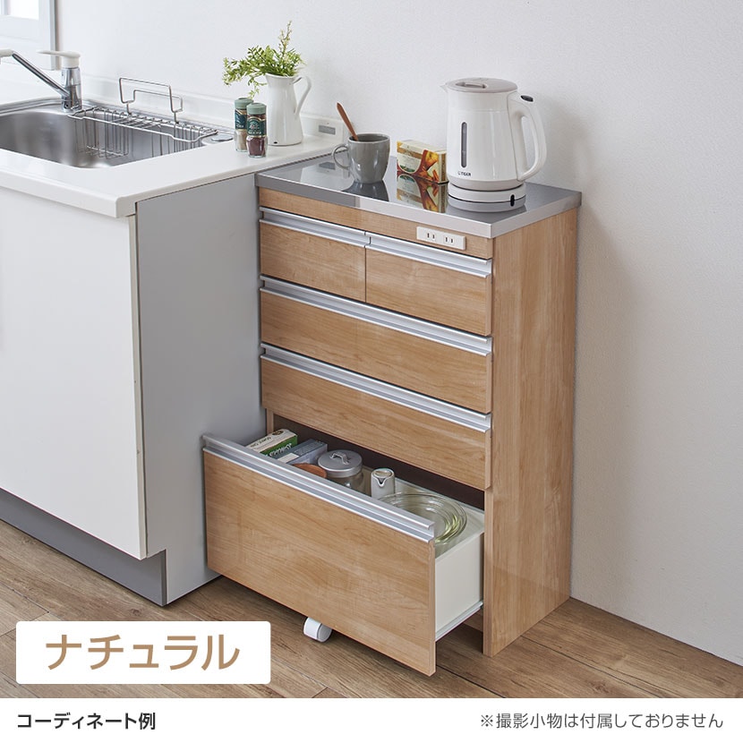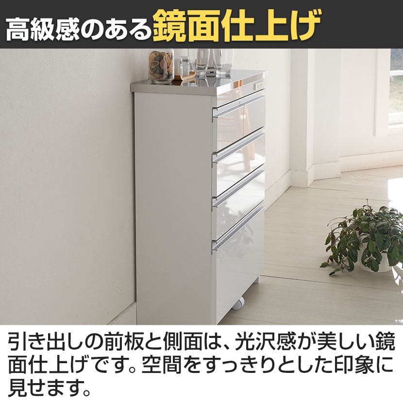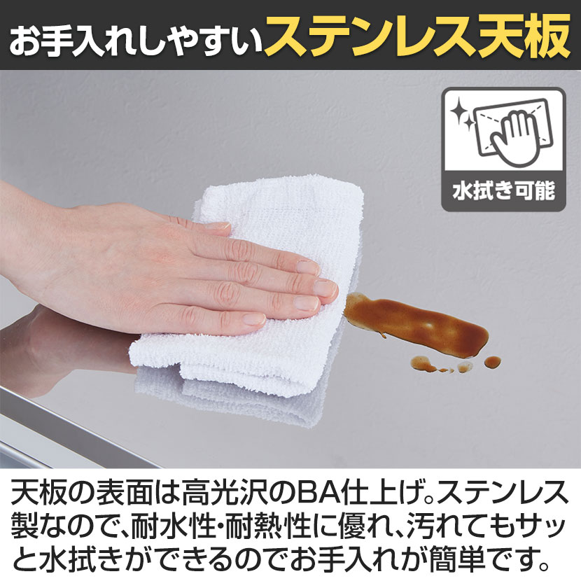 ・水や熱に強く汚れても拭き取りやすいステンレス天板と光沢感が美しい鏡面仕上げのキッチンカウンターです。