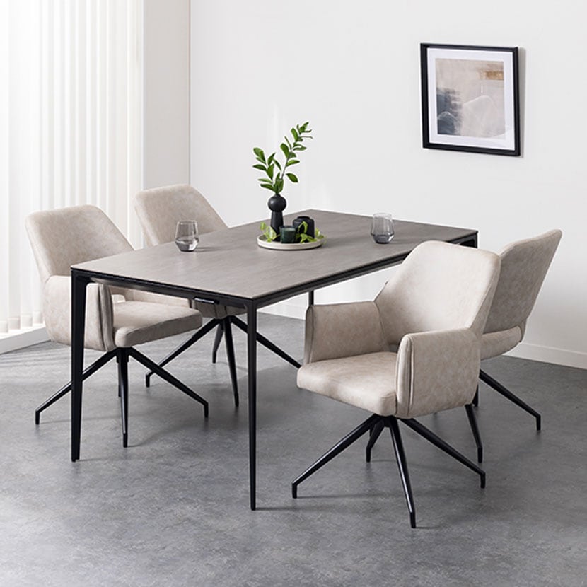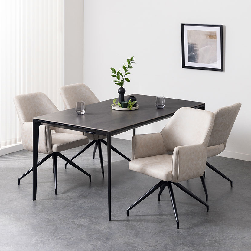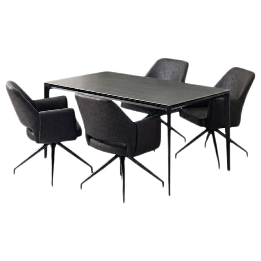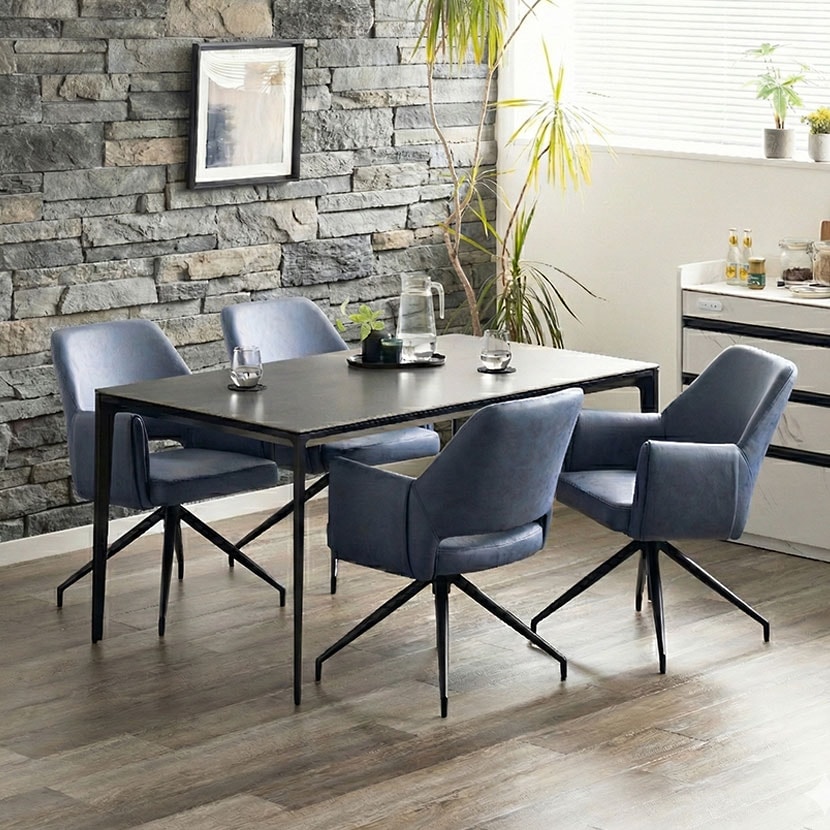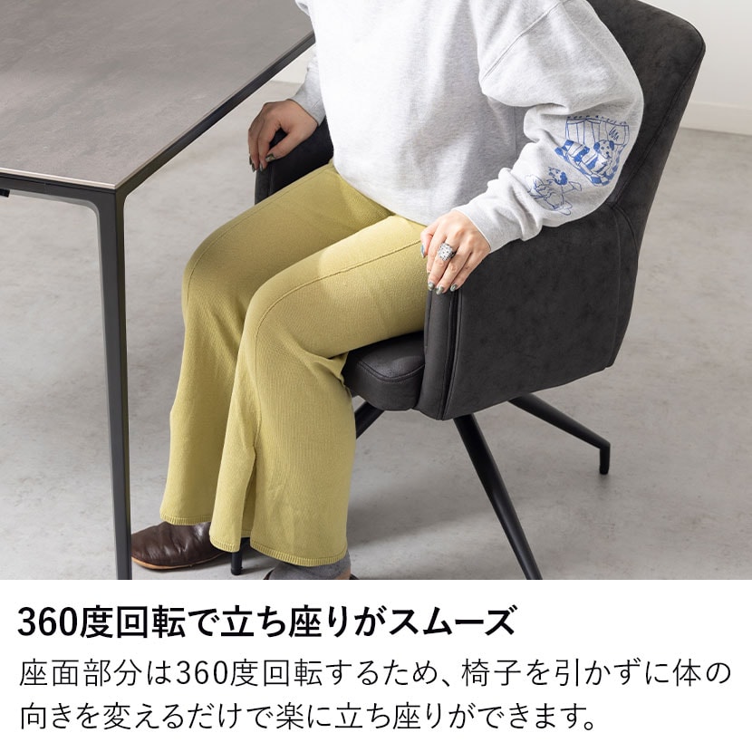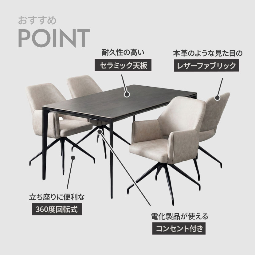 レザーファブリック張地で、立ち座りに便利な360度回転するチェア4脚のダイニング5点セット。