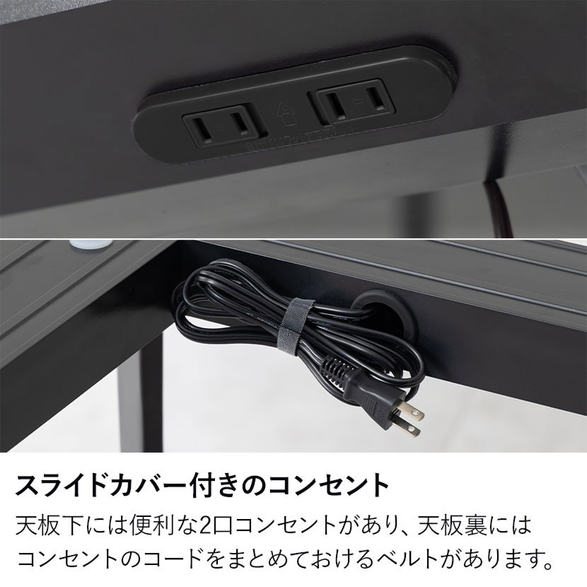 天板下には便利な2口コンセントを備えています。スライドカバー仕様でホコリが入りにくいです。