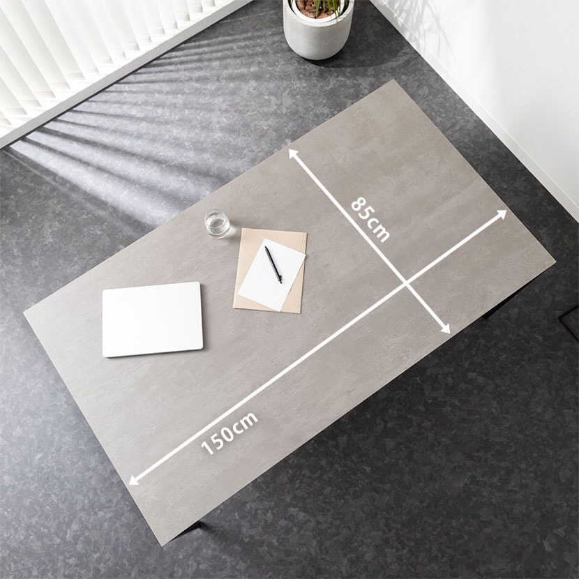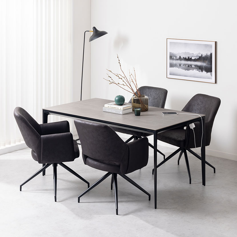 モダンで高級感あふれるセラミック天板、機能性を高めるコンセントを備えた幅150cmのテーブルと