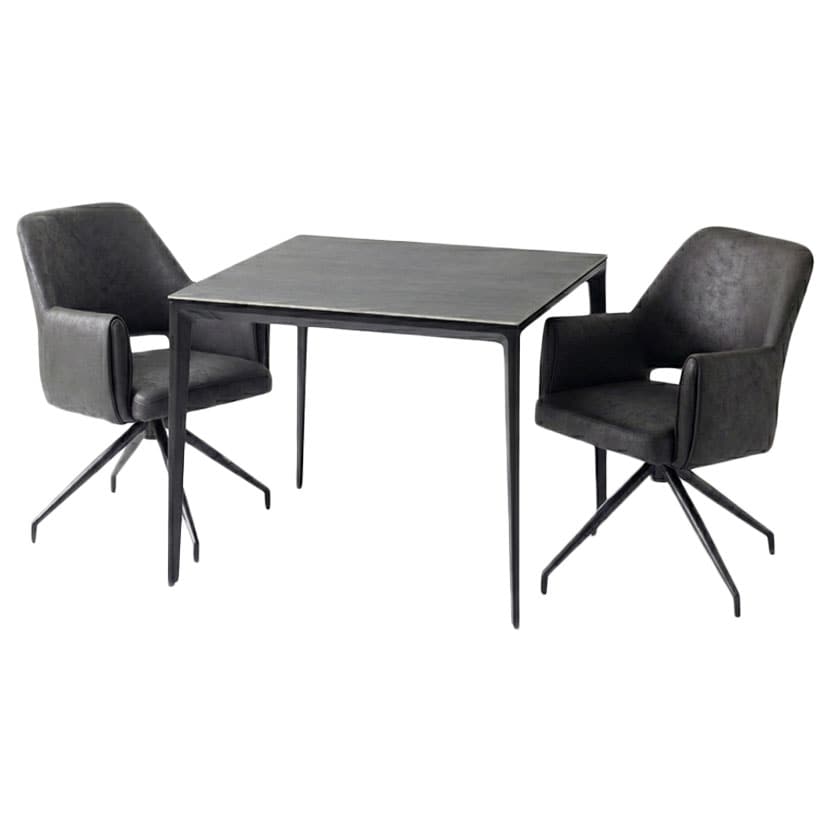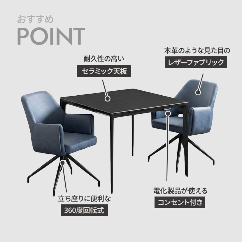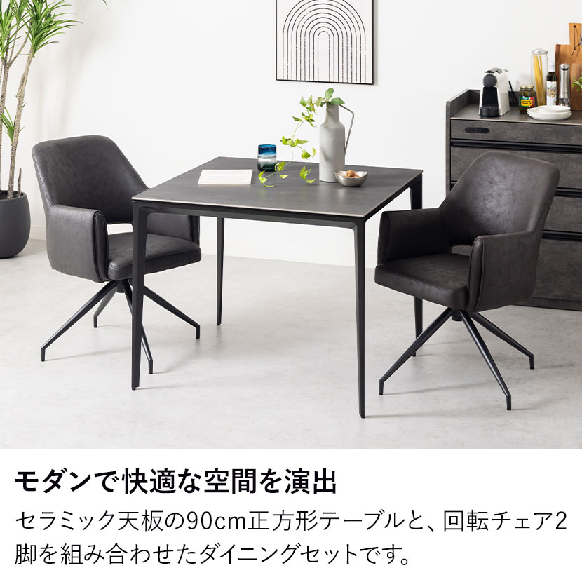 レザーファブリック張地で、立ち座りに便利な360度回転するチェア2脚のダイニング3点セット。