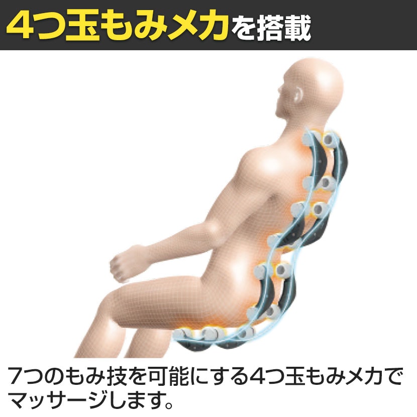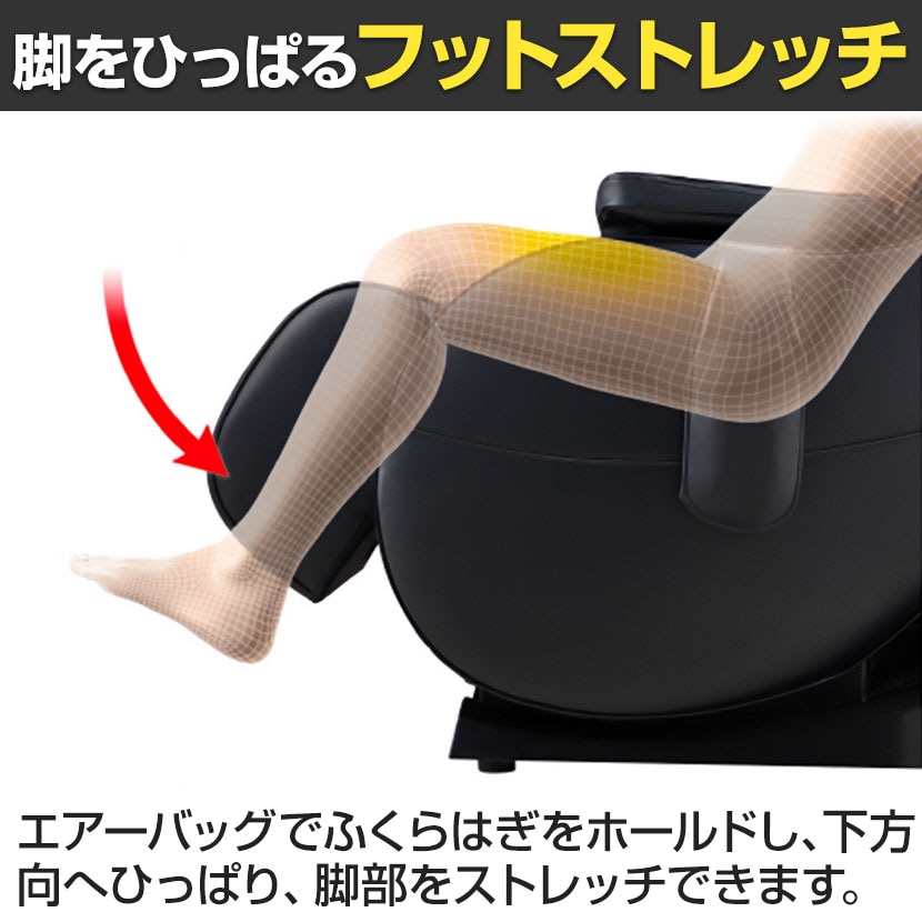 腰、座面、ふくらはぎ部分にエアーバッグを10個内蔵。フットストレッチ、ふくらはぎヒーター搭載。