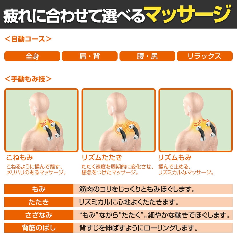・コンパクトながら、もみ技のバリエーションも多く、飽きのこないマッサージをお楽しみいただけます。
