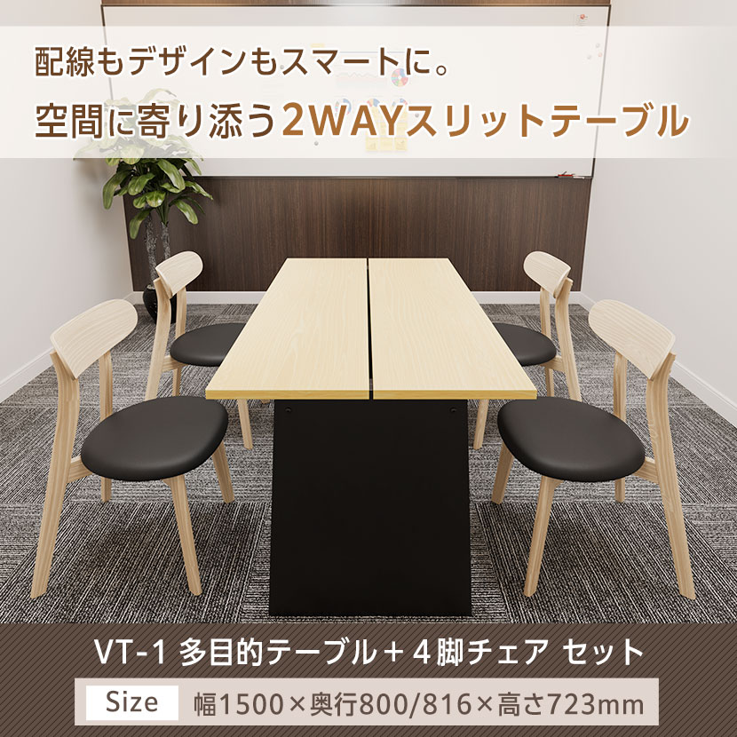 アッシュ材の美しい木目が際立つミーティングテーブルと、快適な座り心地のチェア4脚セット。ウレタン塗装でお手入れ簡単、台形脚で足元すっきり。中央スリットは2段階調整で配線も美しく整理できます。チェアはカーブ背もたれと木目が魅力で、床にやさしいフェルト付き。オフィスやラウンジに自然な温もりと上質感をプラスする多目的テーブルセットです。
