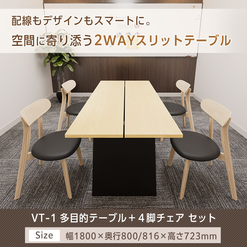 アッシュ材の美しい木目が際立つミーティングテーブルと、快適な座り心地のチェア4脚セット。ウレタン塗装でお手入れ簡単、台形脚で足元すっきり。中央スリットは2段階調整で配線も美しく整理できます。チェアはカーブ背もたれと木目が魅力で、床にやさしいフェルト付き。オフィスやラウンジに自然な温もりと上質感をプラスする多目的テーブルセットです。
