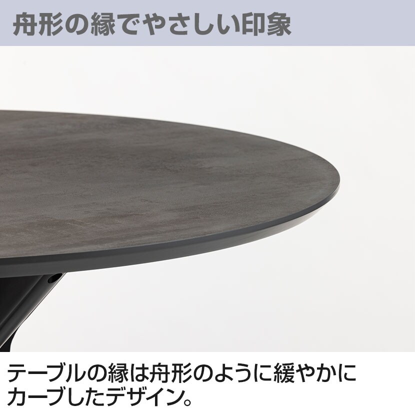 テーブルの縁は舟形のように緩やかにカーブしたデザイン。天板を薄くスタイリッシュに見せる視覚効果もあります。