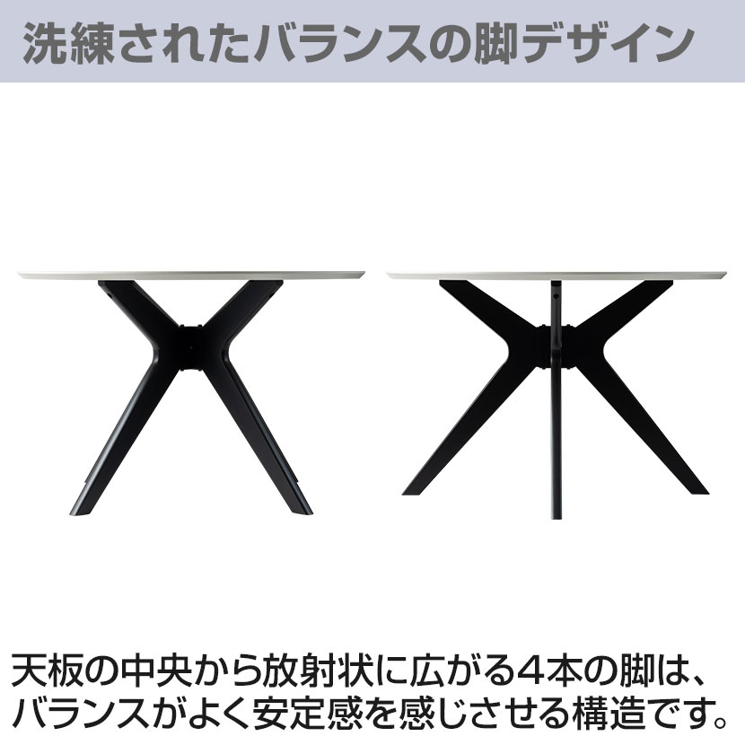 円形の天板の中央から放射状に広がる4本の脚は、視覚的にバランスがよく、安定感を感じさせる構造です。脚の配置は単なる支えではなく、空間に動きとリズムを生み、ラウンド天板の柔らかな印象と組み合わさることで、シンプルながらも洗練されたデザインを実現しています。