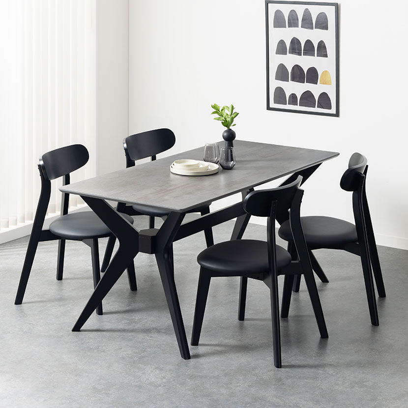 幅1550mmのミーティングテーブルは、会社の会議室や応接室にぴったり。チェアを4脚合わせるのにちょうどいいサイズ感です。天板が高級感のある石目調で、ストーンホワイトとストーンブラックの2色を展開。チェアは背もたれの曲線とアッシュ木目、PVC座面で適度な硬さかつお手入れ簡単。モダンで洗練されたデザインが、会議や応接の場を快適に彩る一台です。