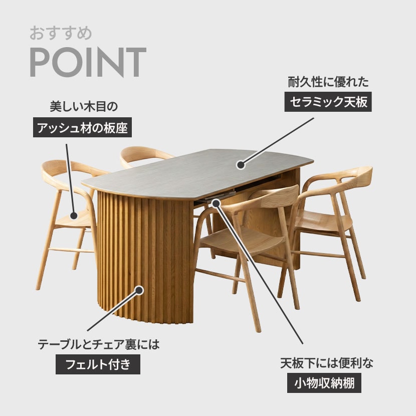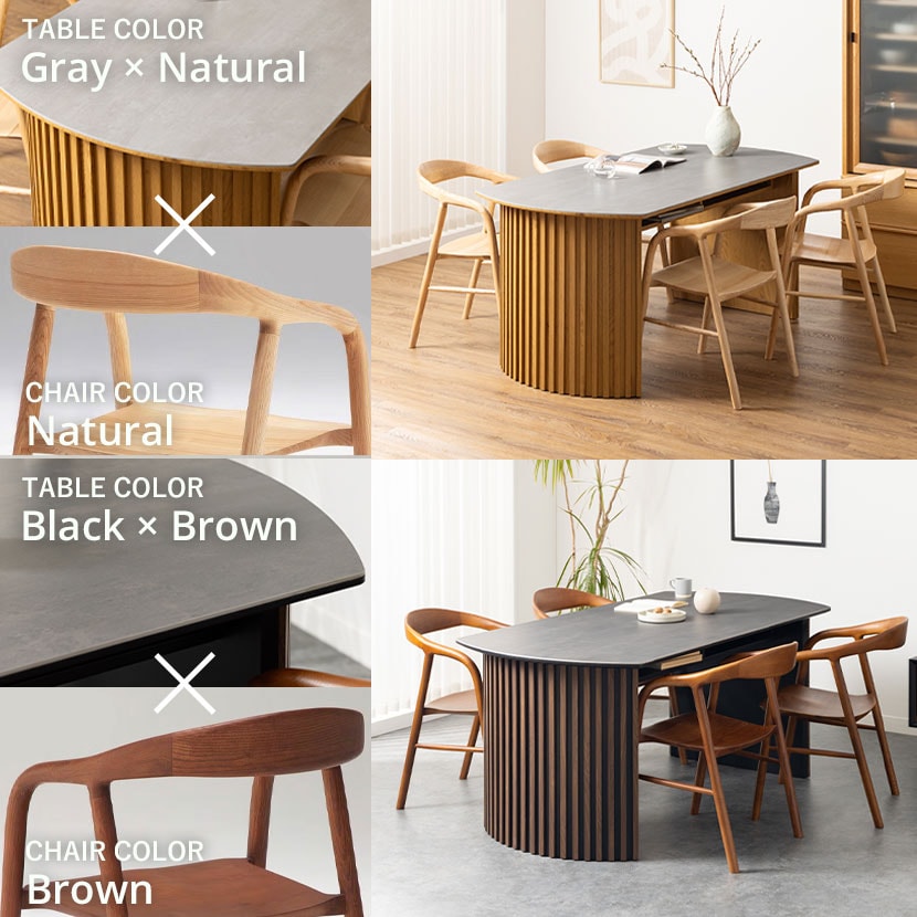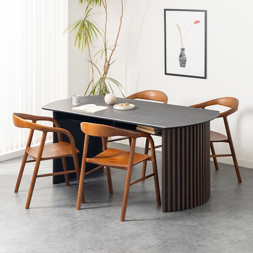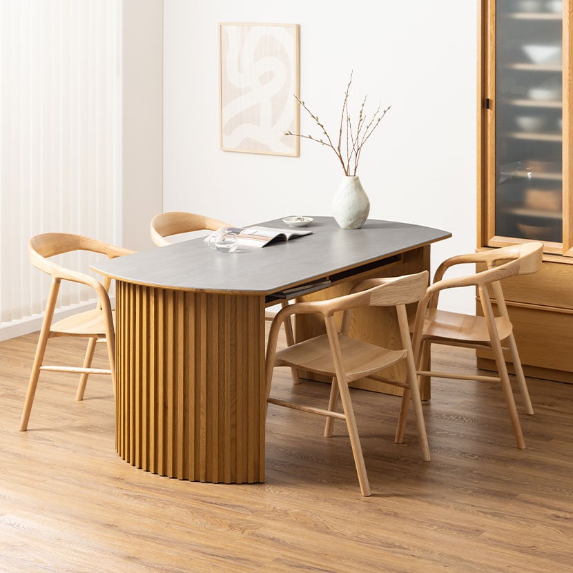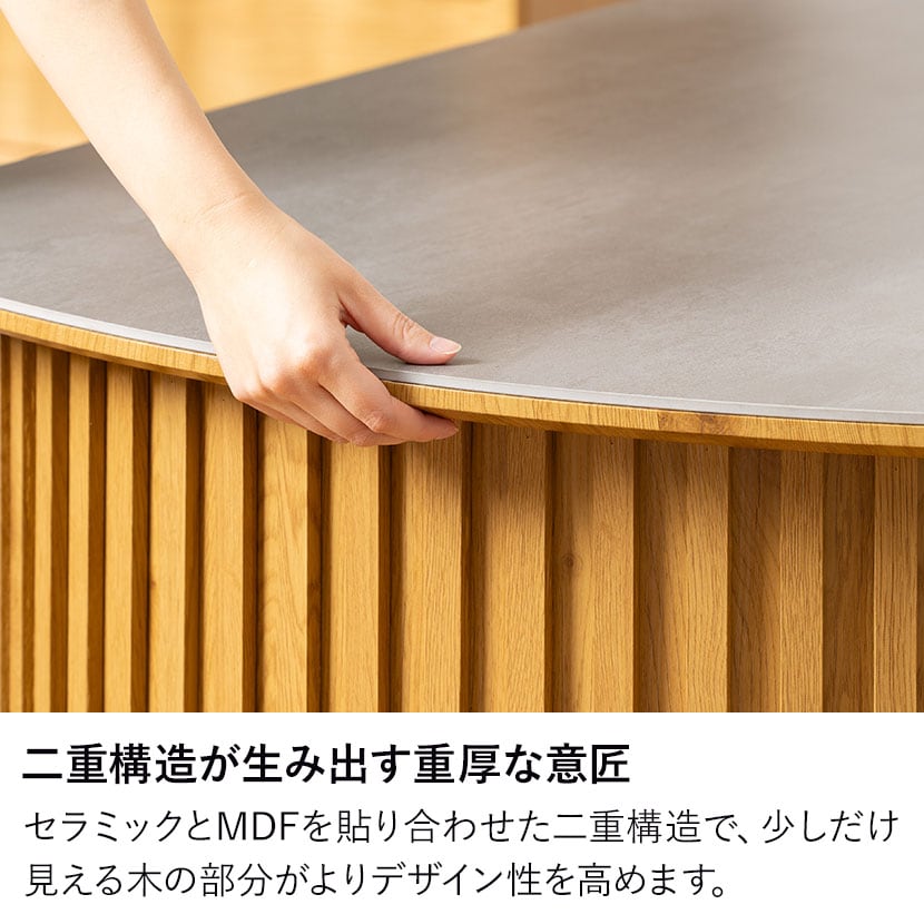 セラミック天板の重厚な質感と、アーチ型の格子脚のシルエットが、日々の食卓を格上げします。