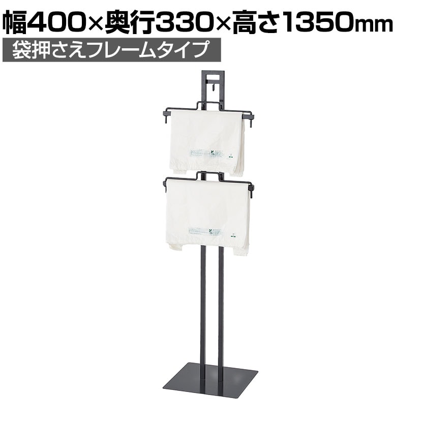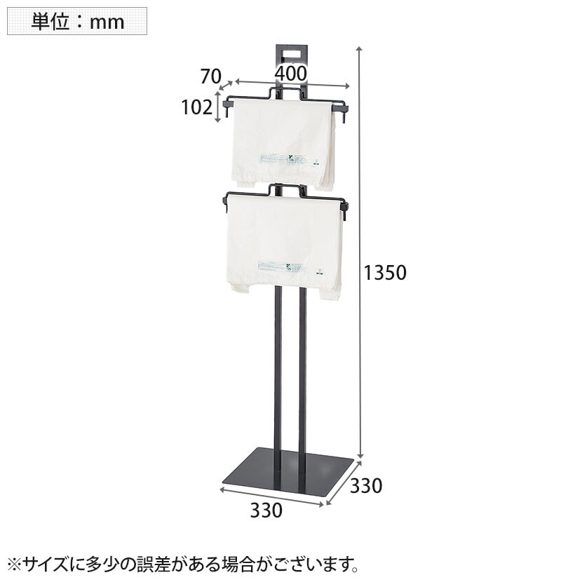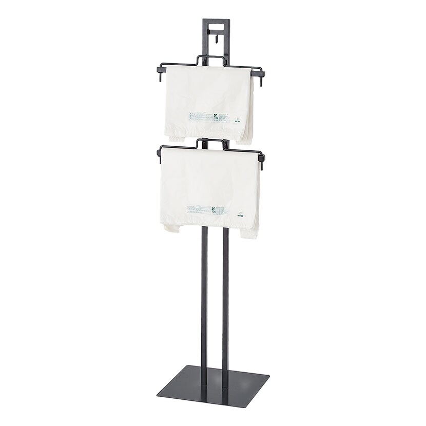 レジ横でお客様にレジ袋を選んで取っていただくためのレジ袋スタンド什器です。レジ袋の必要枚数を聞く手間が省けます。