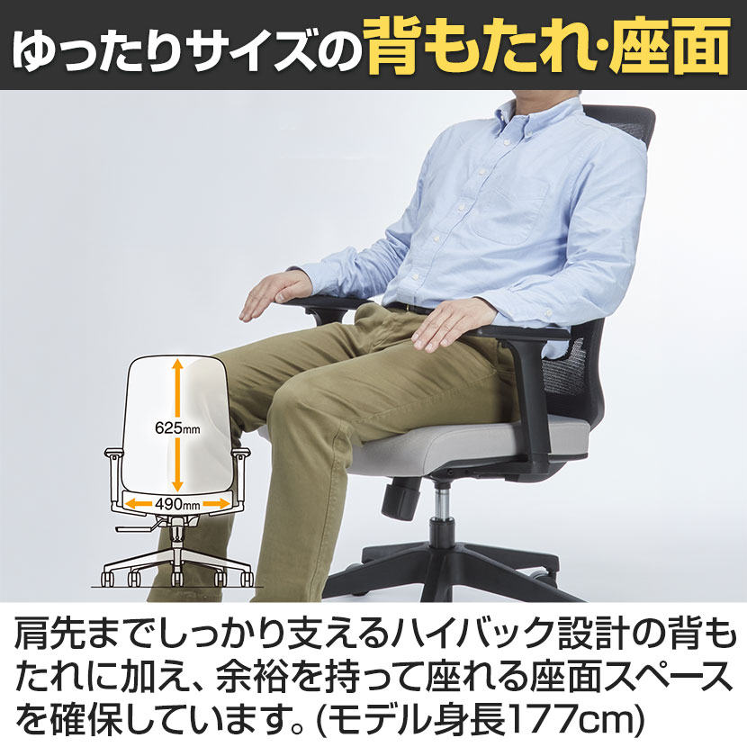 ハイバック設計の背もたれと余裕をもって座れる座面スペース。