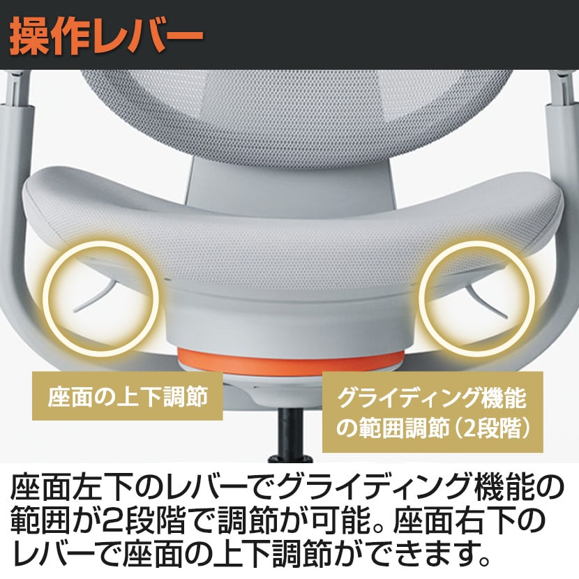 座面左下のレバーでグライディング機能の範囲が2段階で調節が可能。座面右下のレバーで座面の上下調節ができます。