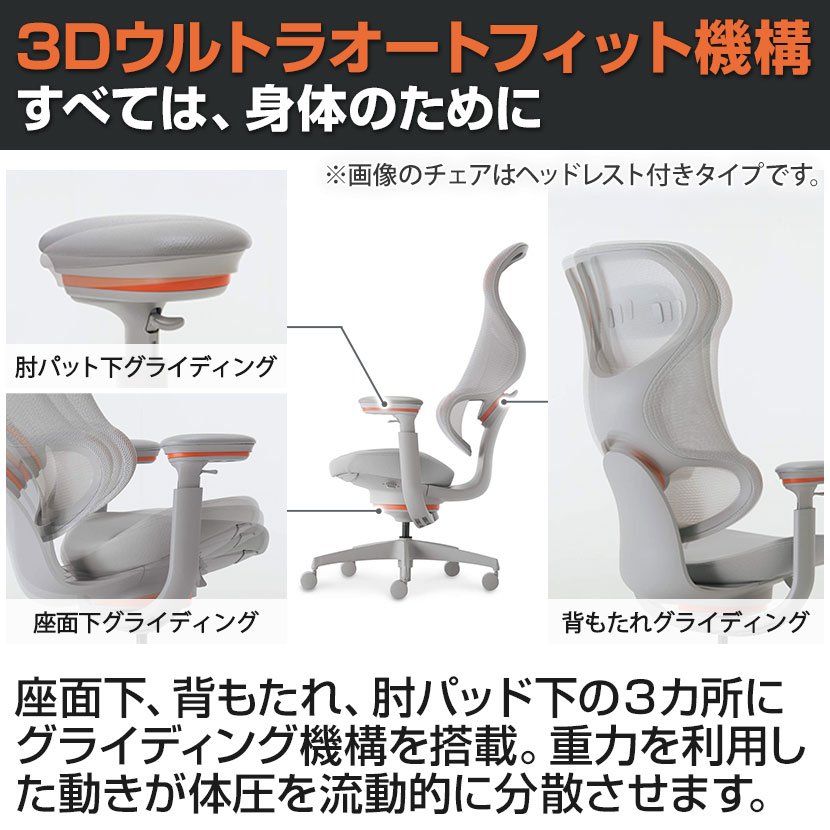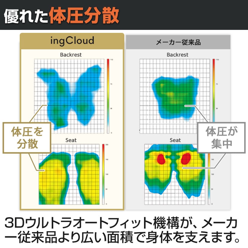 身体が驚く、これまでにない座り心地を追求した体圧分散。先進の「3Dウルトラオートフィット機構」が、無意識の微細な動きにシンクロして、あらゆる身体の動きに寄り添います。メーカー従来のオフィスチェアに比べ、より広い面積で全身を支えることで局所的な圧迫を軽減します。すべては長時間座る人のために、たしかな快適さを追求した一脚です。