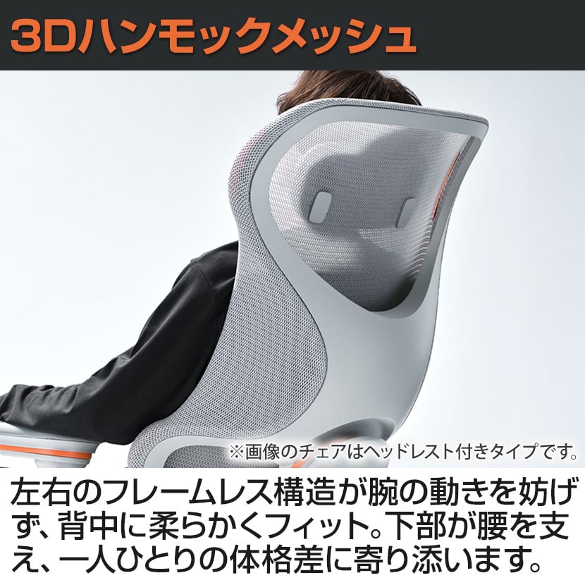 左右のフレームレス構造が腕の動きを妨げず、背中に柔らかくフィット。下部が腰をしっかり支えることで、ランバーサポートなどの調節なしで一人ひとりの体格差に寄り添い、理想のサポート力を実現します。
