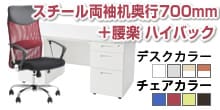 スチールデスクは配線カバー2ヶ所と引き出し、ファイルなどを大量収納できる両袖付き。チェアはダブルランバーとS字構造が負担を軽減。ロングセラーの組み合わせです。 -