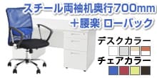 スチールデスクは配線カバー2ヶ所と薄型引き出し、ファイルなどを大量収納できる両袖付き。チェアはシンプル&コンパクト設計です。デスク3色・チェアは豊富な5色展開。 -