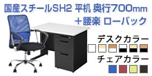 デスクは国産品質&スマートデザイン、ワイドサイズ。薄型引き出しと配線ホール、袖箱にオールロック錠を搭載。チェアの弾力ランバー&反力ベルトが腰の負担を軽減します。 -