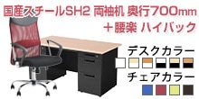 【デスクチェアセット】国産スチールデスクSH 両袖机 1400×700 + メッシュチェア 腰楽 ハイバック 肘付き